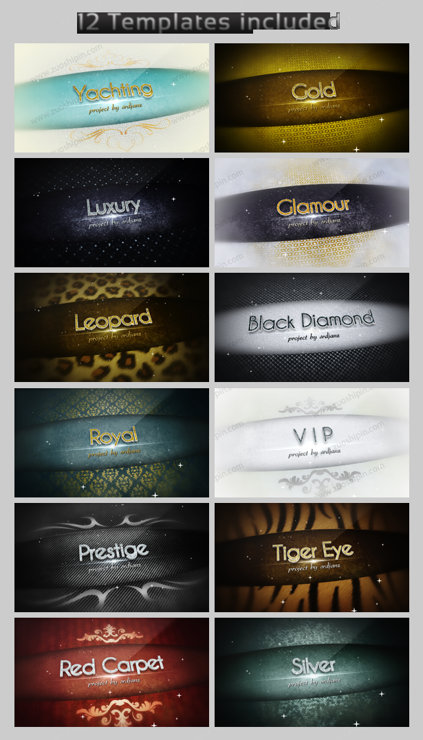 - 12 Templates: (Yachting, Gold, Glamour, Luxury, Leopard, Black Diamond, Royal, V I P, Prestige, Red Carpet, Tiger Eye, Silver)