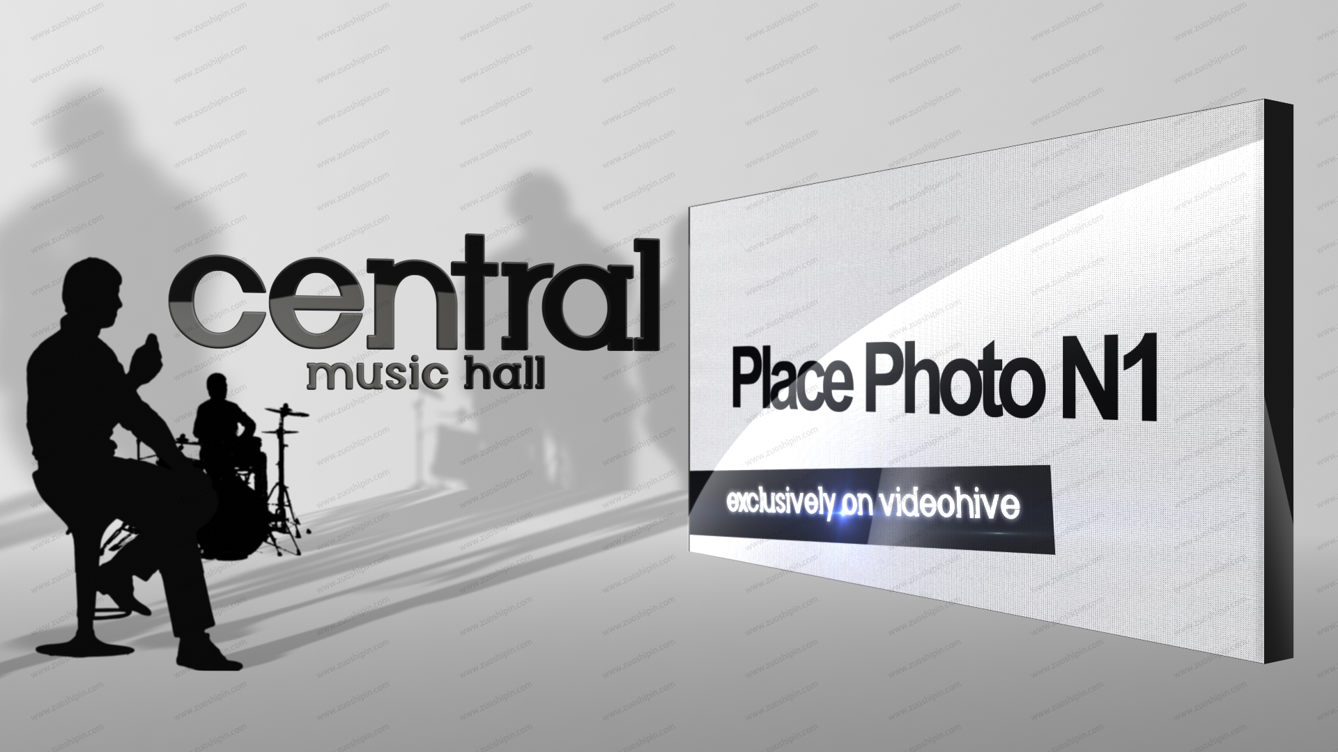 - Cool, editable 3D Text, many additional opportunities for the text (for web address slogans, names of musicians, time and venue).