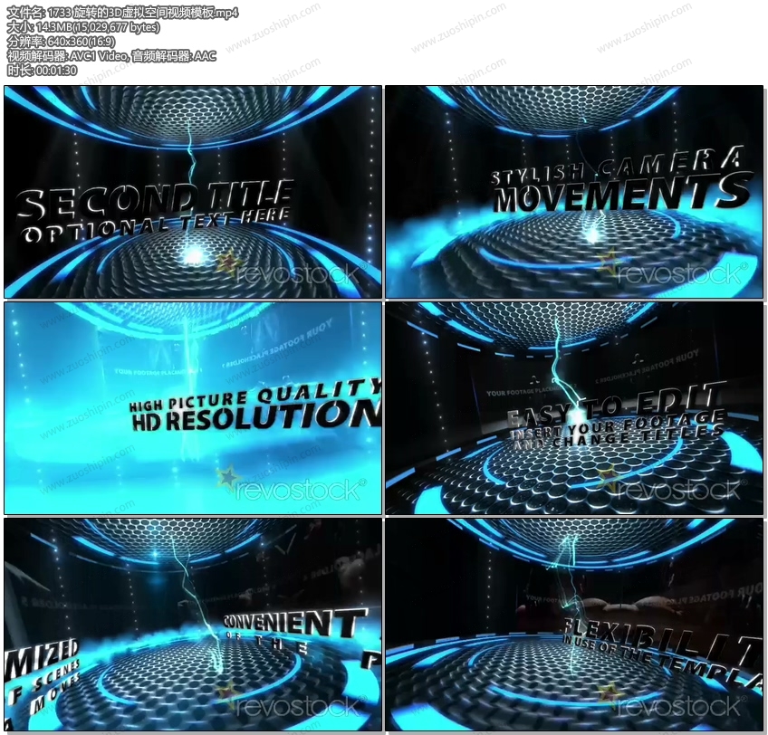 关键词:旋转,3D,立体,虚拟,空间,文本,文字,标题,视频,开场,片头,AE,模板,素材
