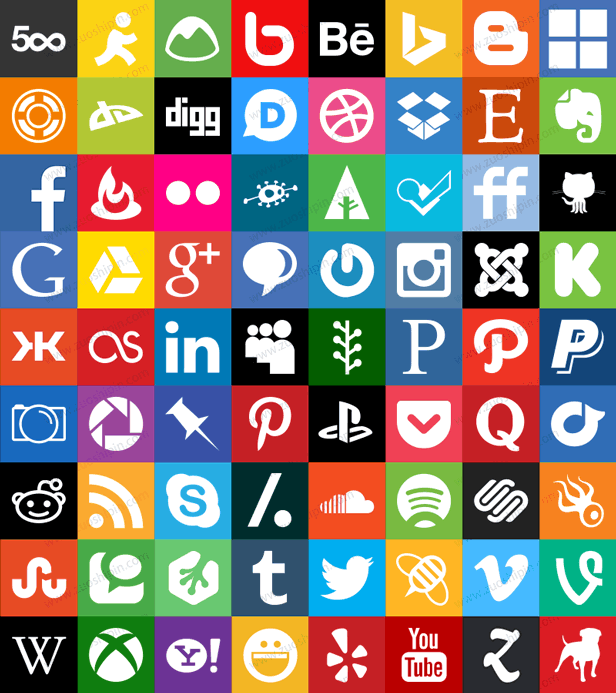 500px, AIM, Basecamp, Bebo, Behance, Bing, Blogger, Delicious, Design Float, DeviantART, Digg, Disqus, Dribbble, Dropbox, Etsy, Evernote, Facebook, Feedburner, Flickr, Folkd, Forrst, Foursquare, Friendfeed, Github, Google, Google Drive, Google+, Google Talk, Gravatar, Instagram, Joomlas, Kickstarter, Klout, Last.fm, LinkedIn, MySpace, Newsvine, Pandora, Path, PayPal, Photobucket, Picasa, Pinboard, Pinterest, Playstation, Pocket, Quora, Rdio, Reddit, RSS, Skype, Slashdot, SoundCloud, Spotify, Squarespace, Squidoo, StumbleUpon, Technorati, Treehouse, Tumblr, Twitter, Videohive, Vimeo, Vine, Wikipedia, Xbox, Yahoo!, Yahoo! Messenger, Yelp, YouTube, Zoo Tool, Zynga