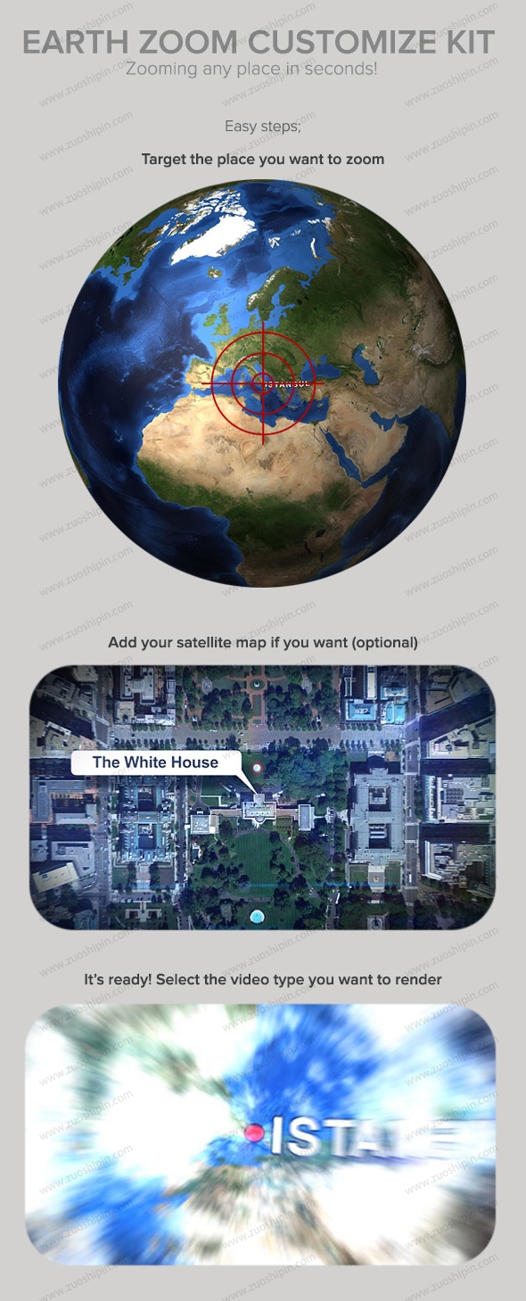 Just point the place/city/country and your world zoom animation will be ready automatically! Camera will start from space and it will fall into earth to your selected point. Zoom wherever you want!