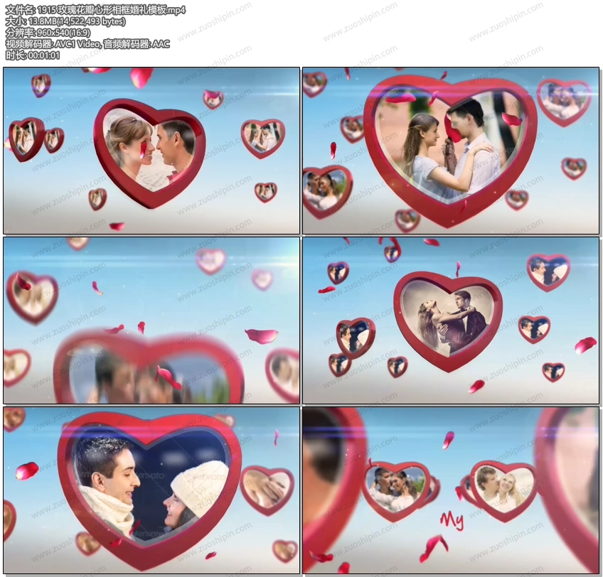 关键词:玫瑰,花瓣,心形,相框,照片,相片,图片,婚礼,婚庆,结婚,相册,AE,模板,素材