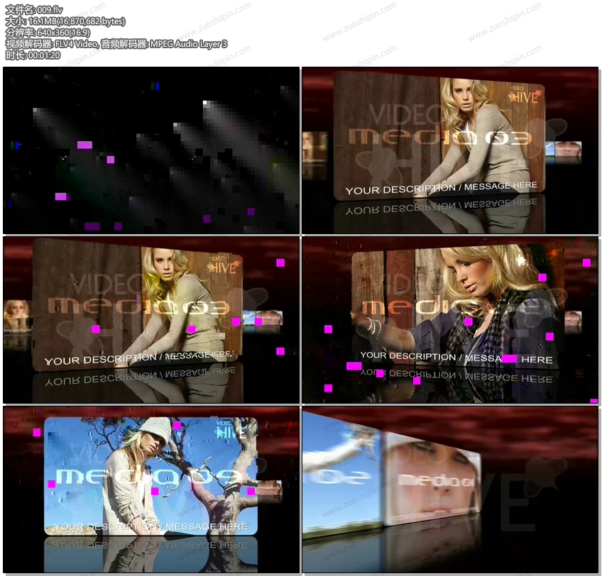 Well over a minute of classy, serene, reflected animation of your images, videos, messages and logos – with a 3D camera ‘follow and fly-by’ at the end.