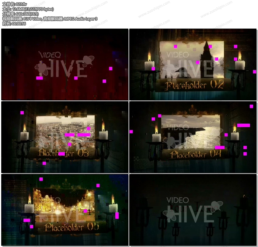 - 3 pre rendered elements ( candle fire – 4,7mb, graphics background effect – 64mb and curtains – 17mb )