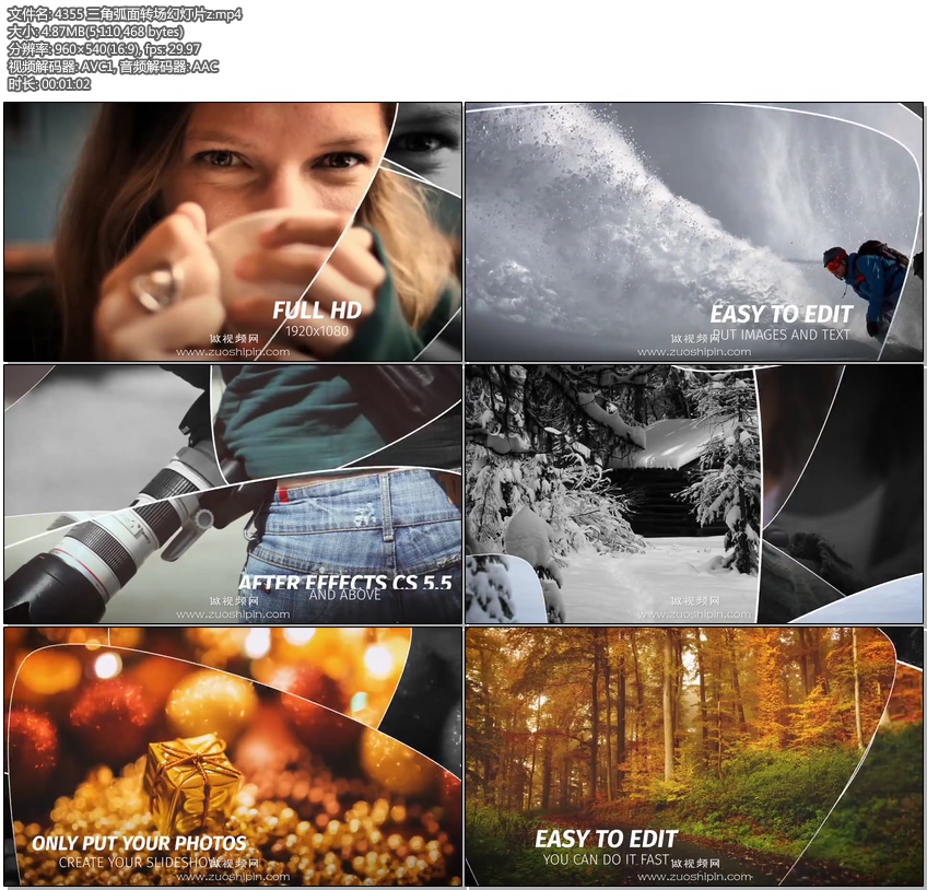 关键词:三角,弧面,转场,过渡,照片,相片,图片,幻灯片,视频,相册,AE,模板,素材