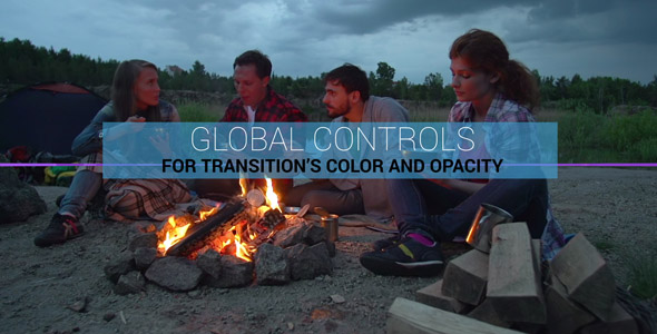 Global color controls change the transition color and opacity for the entire project. Each animated text scene has a control panel for changing text colors, background color, and background box height, width and opacity.