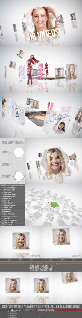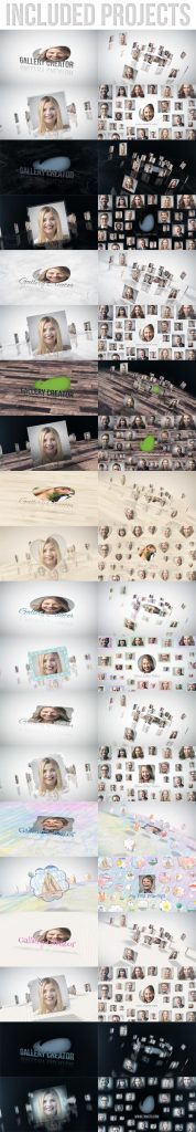Gallery Creator is a complex project easy to use. Create Your personal slideshow in minutes. Drag and drop your photos or videos, adjust size and hit render. Use it for any occasion. Share your family photos through up to 54 placeholders in your own style. Use it for business, travel, commercials, ads, presentations, weddings, friends, birthdays and more. 10 different after effects projects are included and ready to use. All textures (Frame and Floor textures) from the video preview are included.