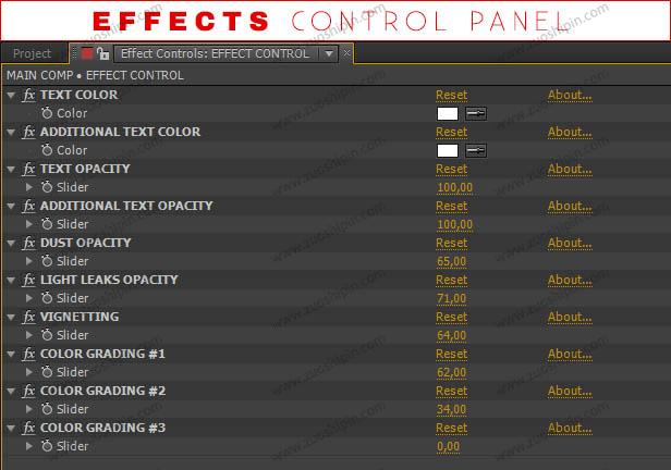 You can easily change the text colors and opacity, vignetting, light leaks, color grading in some clicks.