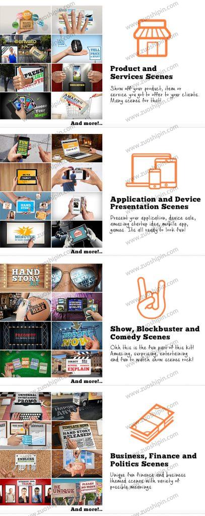 Hand gestures include touch screen, swipe, drag, open, break, holding product and promo. Various 3D animations to display responsive devices, reveal big blockbuster opener, gambling and games, presentation of company infographics, online shops, website browsing and much more! Can be interpreted as Point Of View ( pov ) also usable for virtual reality commercials!