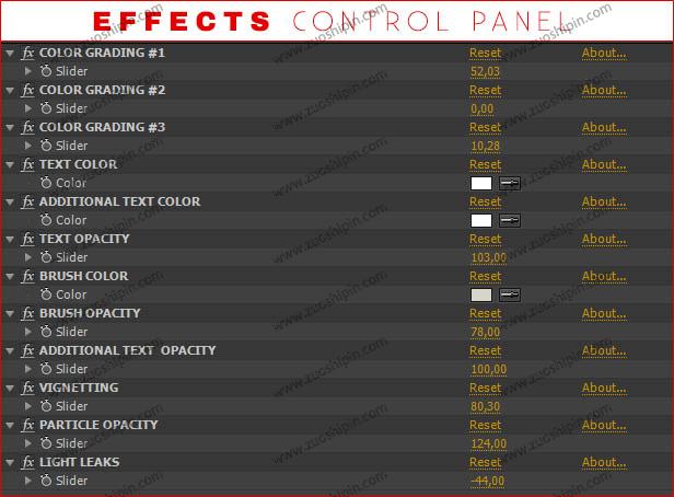 You can easily change the text colors and opacity, vignetting, light leaks, color grading in some clicks.