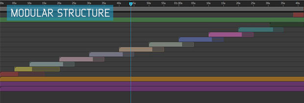 The template structure is fully MODULAR. Scenes can be shifted, scene duration can be changed, additional scenes can be added easily.