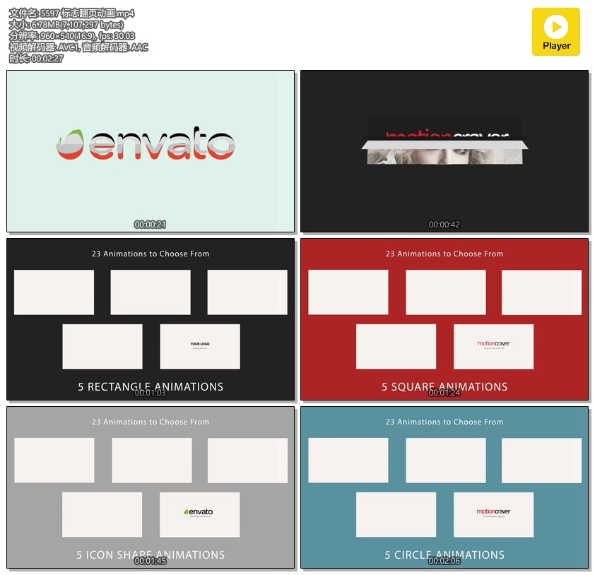 - 23 Animations Provided:5 Rectangle, 5 Circle, 5 Square, 5 Icon Only, 3 Logo Only
