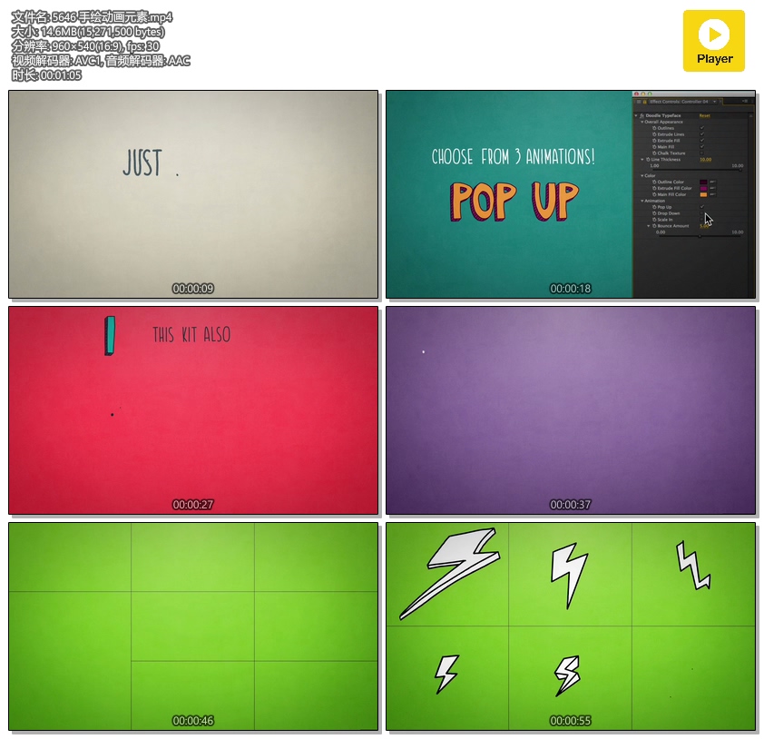 - The third item is a pack of pre-animated doodle elements. Each one animates in and out. These are perfect for creating animated reveals of your titles.