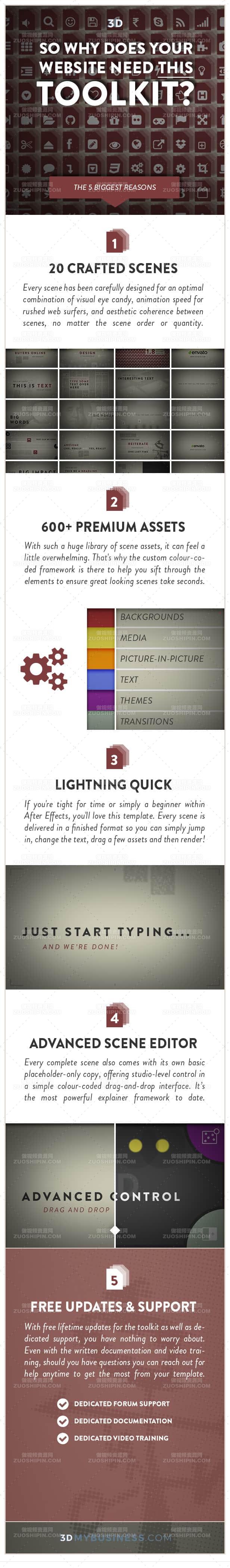 There are no less than 20 carefully crafted scenes and over 600 premium assets. You have a flexible template for creating short marketing videos to help your launches and presentations get the maximum exposure they can.